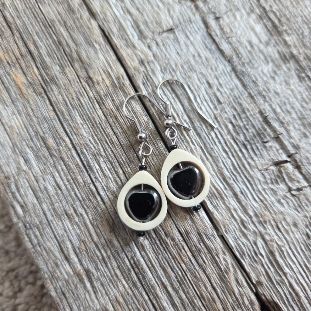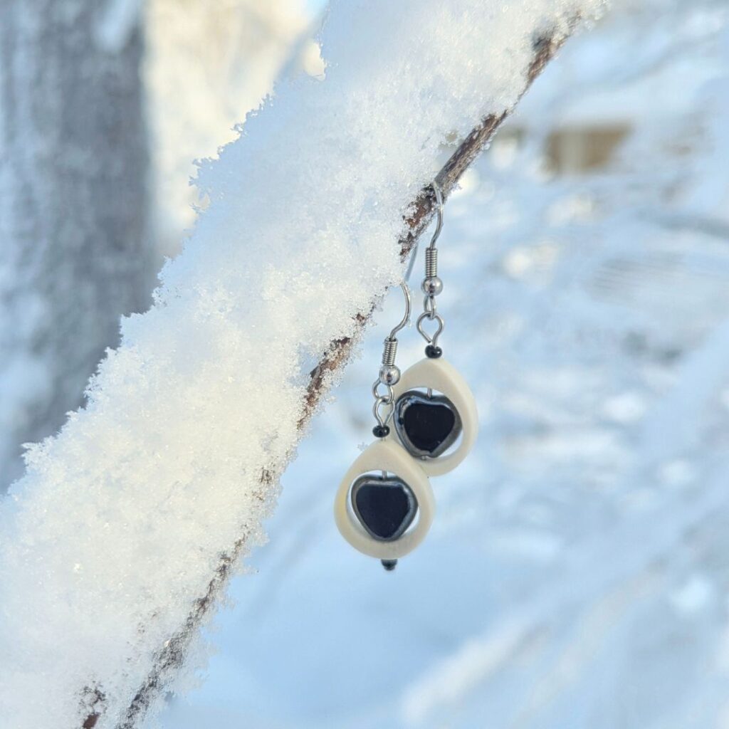 Sydän on korumaailmassa hyvin suosittu muoto ja myös meidän sydän-korut ovat olleet asiakkaidemme suosikkikoruja. Korussa on poronsarvesta tehty osa, johon on liitetty musta, sydämenmuotoinen lasihelmi. Näitä sydänkorvakoruja on saatavilla vain kaksi paria, sillä mustia sydänhelmiä ei ole enää enempää. Korvikset ovat kevyet ja siksi mukavat korvissa. Ne eivät ole liian isot ja sopivat monenlaisiin asuihin.